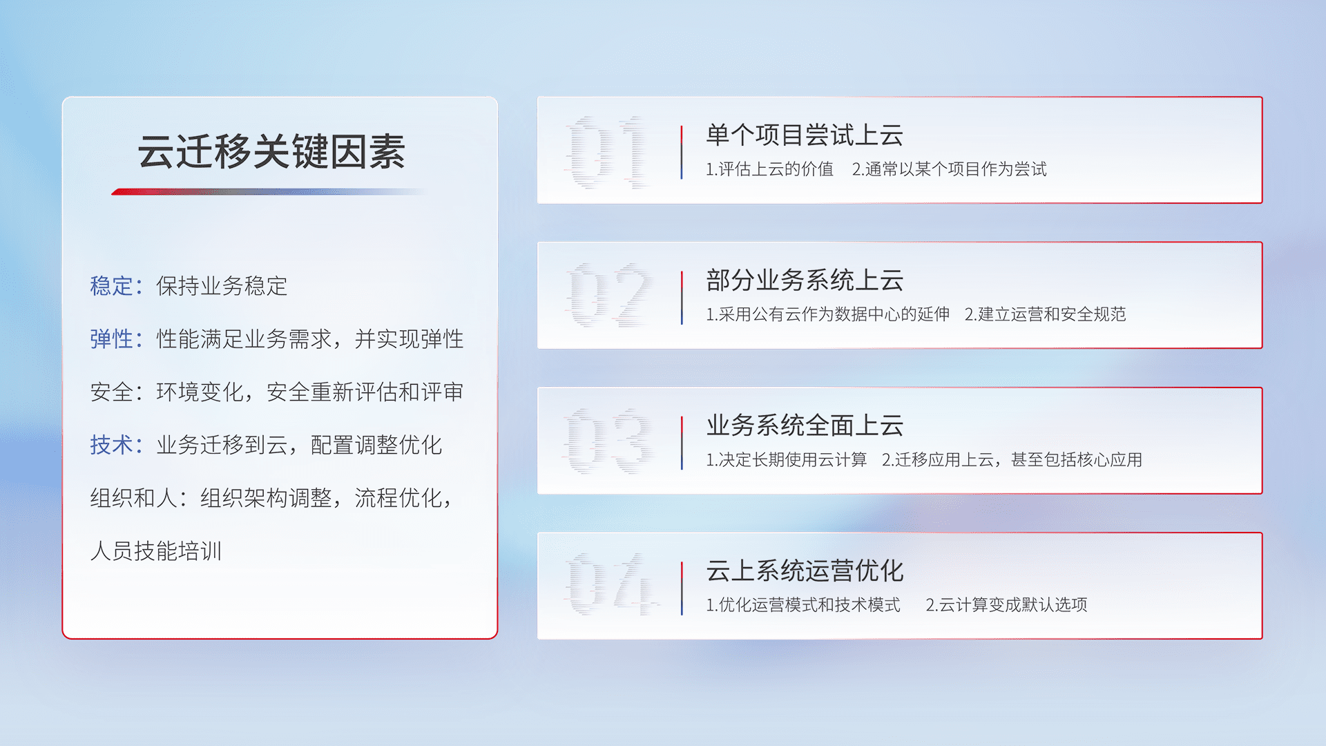 结合实际业务,,从规划设计、、、云平台选型、、、云原生改造、、数据迁移、、、、集成交付,,,,迁移全过程为客户识别最佳上云路径,,,做好风险识别管理,,设计网络架构、、身份权限、、、、安全审计合规、、、操作审计、、、、日志审计、、监控告警策略、、、多站点容灾设计等,,,,对云上基础设施进行整体规划,,,提升IT治理水平,,,以满足弹性、、、、高可用、、、高性能的需求。。。