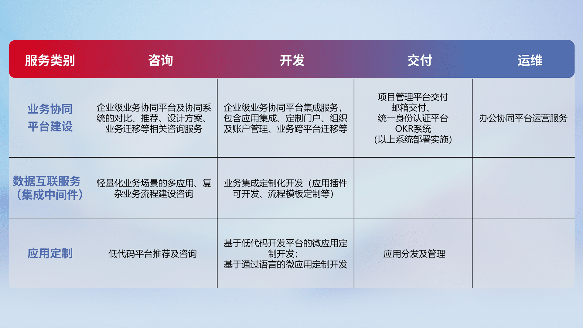 针对钉钉、、、企微、、IDaas等平台级产品提供产品的规划、、、方案、、、交付、、、定制化开发等服务,,,,实现如统一协同办公、、、、智能客户服务、、、、混合会议管理、、、、智能数据查询、、、、等业务场景,,,,实现数字化转型。。